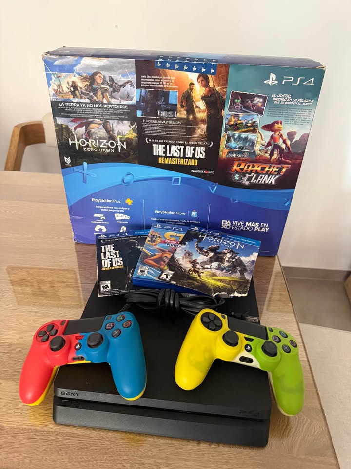 Play Station 4 slim 500Gb con 2 controles Dual Shock y películas Crash, Horizon Zero Down, The last of us, PES 2019
